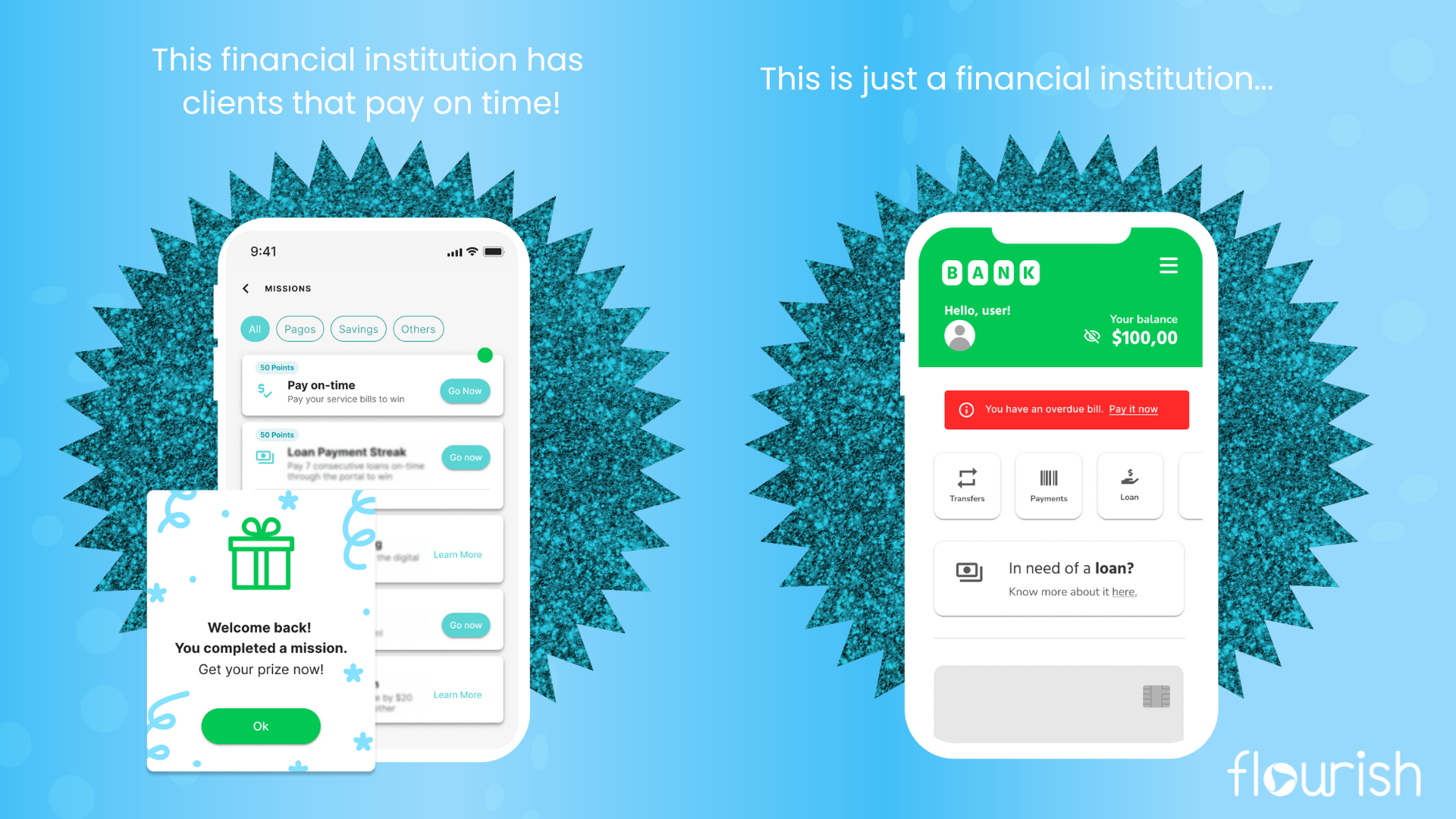 Flourish Fi aims to partner with banks and credit unions to offer an innovative engagement platform that combines gamification and behavior science to keep customers loyal. Our technology is designed to help individuals develop better money habits, increase financial well-being, and achieve their goals effectively by paying bills on time and developing the habit of checking their bank apps and learning about the possibilities offered by the financial institution. By integrating Flourish's solution the financial institution develops intelligence to create personalized journeys that help your users to be healthy financially while using your account as their main one.