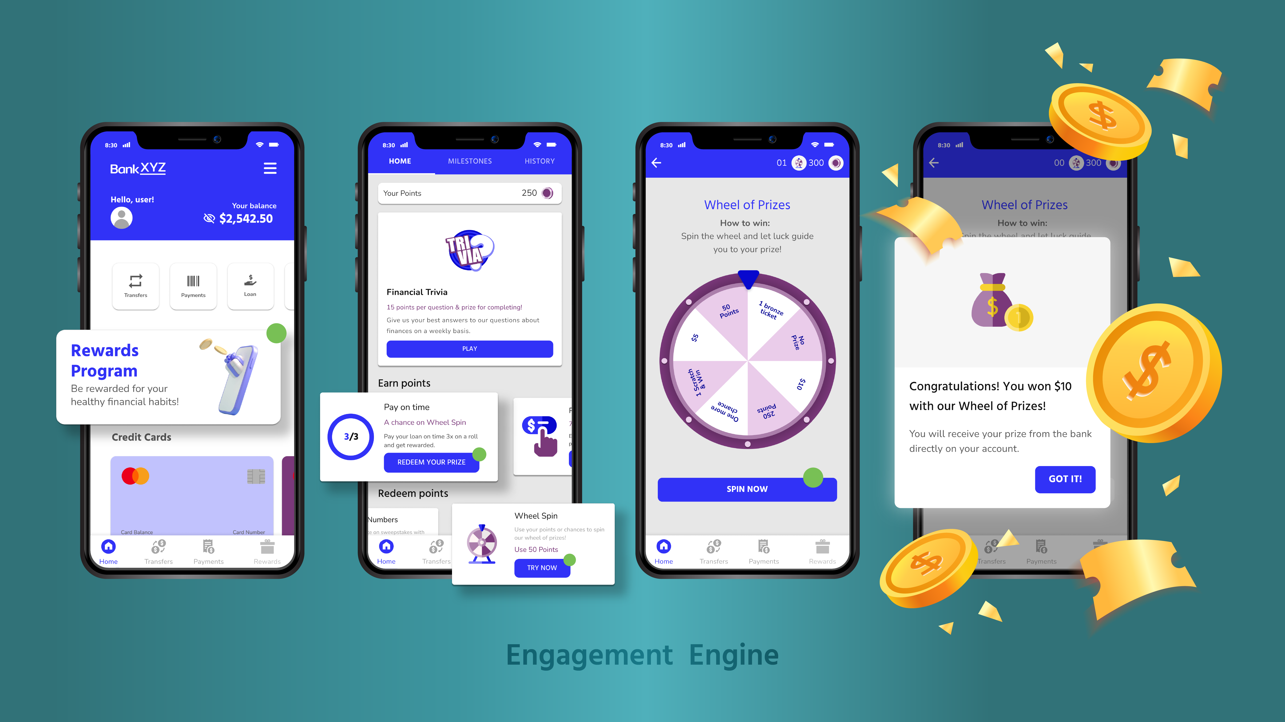 Com essa combinação, os clientes têm uma jornada que começa com o desafio de fazer um pagamento dentro do prazo, depois podem ganhar pontos extras jogando um quiz de conhecimentos financeiros, e ao final transformam estes pontos em prêmios por uma roleta raspadinha, tudo dentro do aplicativo da instituição financeira e seguindo o branding da marca.